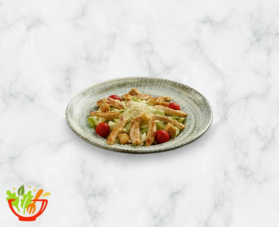 Frischer Salat, spezielles Caesar-Dressing, Croutons, Brotwürfel, Parmesan und Kirschtomaten